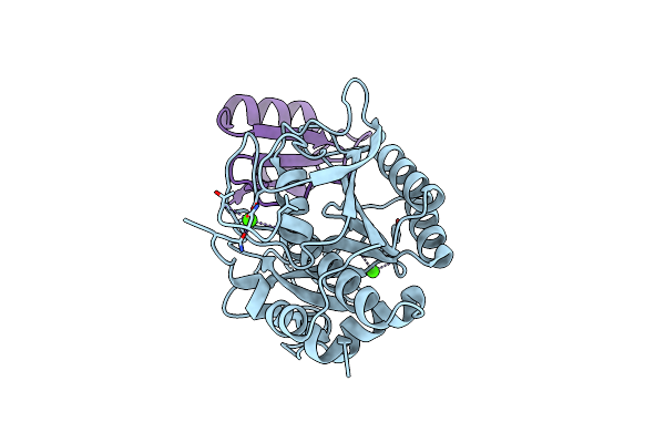 Triclinic crystals of the complex formed by eglin with subtilisin Carlsberg were analyzed by X-ray diffraction. The crystal and molecular structure of this complex was determined with data that extended to 0.12-nm resolution by a combination of Patterson search methods and isomorphous replacement techniques. Its structure was refined to a crystallographic R value of 0.178 (1.0-0.12 nm) using an energy-restraint least-squares procedure. The complete subtilisin molecule could be traced without ambiguity in the refined electron density. The eglin component, from which an amino-terminal segment is cleaved off, is only defined from Lys8I (i.e. the lysine residue 8 of the inhibitor) onwards. Per unit cell, 436 fixed solvent molecules and 2 calcium ions were located. In spite of 84 amino acid replacements and one deletion, subtilisin Carlsberg exhibits a very similar polypeptide fold to subtilisin BPN'. The root-mean-square deviations of all alpha-carbon atoms (excluding those at the deletion site) from models of subtilisin BPN' [Alden, R. A., Birktoft, J. J., Kraut, J., Robertus, J. D. & Wright, C. S. (1971) Biochem. Biophys. Res. Commun. 45, 337-344] and subtilisin Novo [Drenth, J., Hol, W. G. J., Jansonius, J. N. & Kockoek, R. (1972) Eur. J. Biochem. 25, 177-181] are 0.077 nm and 0.103 nm. Most of these deviations result from global shifts rather than changes of the local geometry. The single-residue deletion at position 56 affects only the surrounding conformation. Two sites of high electron density and close distances to surrounding oxygen ligands have been found in the Carlsberg enzyme which are probably occupied by calcium ions. Eglin consists of a twisted four-stranded beta-sheet flanked by an alpha-helix and by an exposed proteinase binding loop on opposite sides. Around the reactive site, Leu45I-Asp46I, this loop is mainly stabilized by electrostatic/hydrogen bond interactions with the side chains of two arginine residues which project from the hydrophobic core [Bode, W., Papamokos, E., Musil, D., Seemüller, W. & Fritz, H. (1986) EMBO J. 5, 813-818]. The reactive site loop conformation resembles that found in other 'small' proteinase inhibitors. The scissile peptide bond is not cleaved but its carbonyl group is slightly distorted from planar geometry. Most of the intermolecular contacts are contributed by the nine residues of the reactive-site loop Gly40I-Arg48I.(ABSTRACT TRUNCATED AT 400 WORDS)