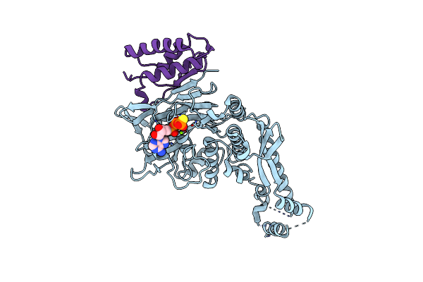 Crystal structure of MukE-MukF(residues 292-443)-MukB(head domain)-ATPgammaS complex, symmetric dimer